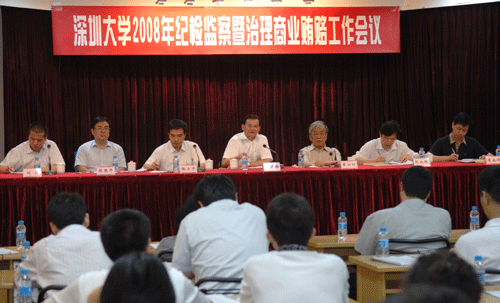 200806-13  我校召開紀檢監察暨治理商業賄賂工作會議6月5日下午,我校在游泳館二樓會議室召開了深圳大學2008年紀檢監察暨治理商業賄賂工作會議。江潭瑜書記、章必功校長在會上講話,陶士平書記分別就我校紀檢監察工作和治理商業賄賂工作作了報告,并傳達了中共中央《建立健全懲治和預防腐敗體系2008―2012年工作規劃》精神。副校長阮雙琛、邢鋒、陳思平、李永華以及校紀委委員,各基層黨委(黨總支)書記、紀委書記,各學院院長,機關部處、教輔部門、直屬教研部門正職領導等近100人參...