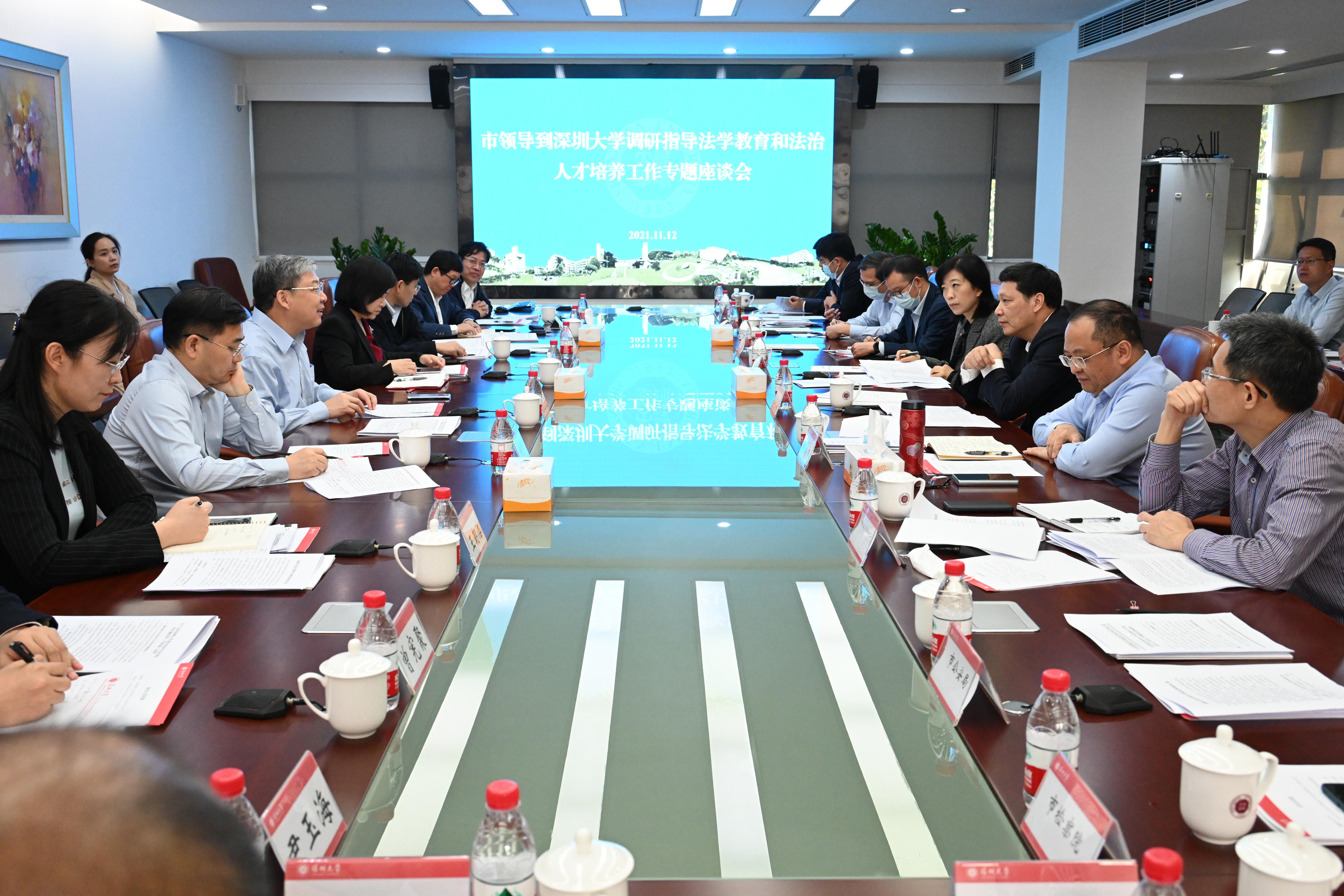 11月12日下午,深圳市委依法治市辦組織相關部門到我校調研法學教育、法治人才培養工作,并召開座談會。會議圍繞如何推進深圳大學建設高水平法學院,共同謀劃深圳法治人才培養工作進行了深入研討。深圳市委常委、政法委書記、市委依法治市辦主任余新國主持會議。深圳市委依法治市辦副主任、市司法局局長蔣溪林,深圳市委政法委副書記汪洪等有關領導,我校黨委書記、校長李清泉出席會議。我校法學院負責人和法學相關專業教師代表參加會議。