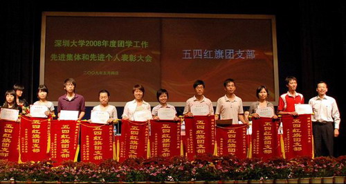 5月4日晚,深圳大學紀念五四運動90周年建團87周年暨團學工作先進表彰大會在國際會議廳隆重舉行。校領導李永華、李鳳亮,校團委、學生處負責人,各基層團委負責人與受表彰的團員干部出席大會。 大會在雄壯的國歌聲、團歌聲中開始。校團委學生副書記張毅哲首先宣讀了校團委《關于表彰深圳大學2008年度團學工作先進集體和先進個人的決定》。在歡快的進行曲中,校領導李永華、李鳳亮等分別向獲得五四紅旗團委標兵、五...