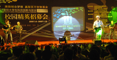 6月15日晚,我校演會中心掌聲陣陣,笑聲不斷,由深圳市科技與信息局、深圳市財政局與深圳廣播電影電視集團主辦的“激揚創業夢想 贏取百萬創智基金――2007深圳大學生科技創新與創業精英賽校園招募會”在此舉行。深圳大學校長章必功、深圳市科技與信息局副局長陸健等領導、我校以及兄弟院校師生共約1600人出席了招募會。