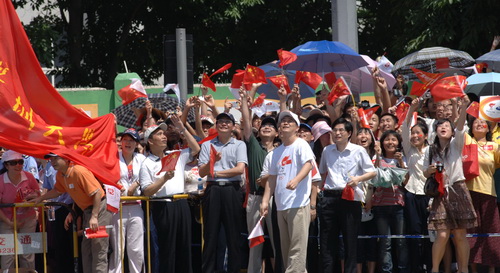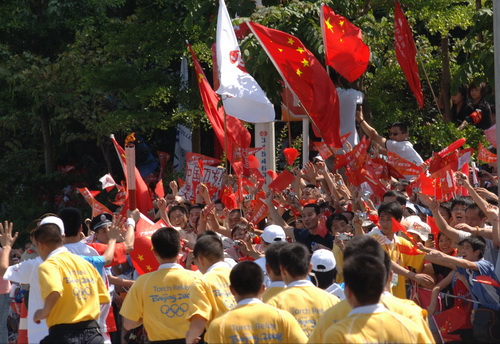 幾個化學與化工學院的大學生表示被現場的熱烈氣氛所震撼。盡管天氣很熱,但她們心中充滿驕傲和喜悅。她們都感到異常激動,表示一定要堅持到底,為中國和奧運加油。