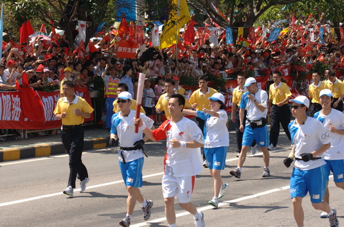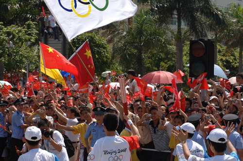 一個來自印度的小伙子,正舉著一面鮮艷的五星紅旗,激動地用力讓紅旗飄揚起來。他說,自己作為外國人,也為中國感到驕傲。他非常喜歡中國,希望印度有朝一日也能有機會舉辦像奧運會這類象征和平友愛的世界型活動。來自意大利的一個男孩也在擁擠的人群里正在尋找最佳觀看地點,他說,自己已經在深圳大學就讀了一年。以前對中國非常不了解,只通過某些電影對中國形成一些印象,但那是非常片面的。他表示現在意大利已經開始較為全面地認識中國,覺得中國人非常友好、熱情。有越來越多的意大利人開始來中國學習、工作,喜歡上中國。他說,自己對奧運會并不十分了解,但是奧運會能讓不同國家很好地相互了解。