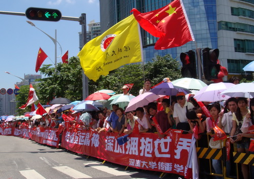 各學院組織師生前來迎接圣火的到來。很多師生上午10點鐘就來到了現場,守候在從深圳大學北門至正門及至西門的路段。校領導江潭瑜、陶士平、阮雙琛、邢鋒、李永華來到現場。“中國加油!”“奧運加油!”的吶喊聲此起彼伏。驕陽如火,師生們熱情更火。很多師生穿著各式各樣的奧運T恤衫,有的將小號國旗、“中國心”貼在面頰、手臂、服裝上,有的手舉小紅旗和五環旗,有的揮著鮮艷的五星紅旗,有的敲鑼打鼓。大家都懷著無比激動的心情來目睹圣火風采?,F場一片歡樂與期待的海洋。