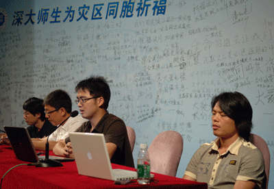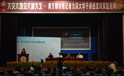 5月29日晚,國際會議廳座無虛席,氣氛肅穆,南方都市報記者豐雷、 姜鏘、徐文閣、陳以懷在此為深大學子講述災區見聞,他們在汶川地震后第一時間進入災區,親身見證了這場舉世震驚的大災難。報告會由黨委宣傳部、社會科學教研部主辦,宣傳部部長王紅主持了會議。