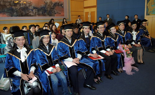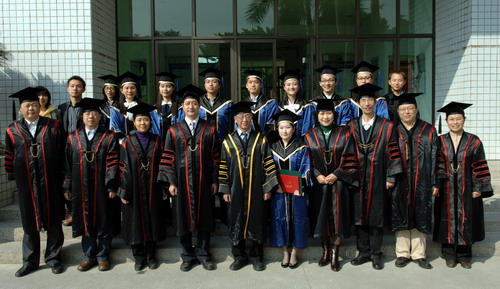 畢業典禮在莊嚴的國歌聲中開始。陶一桃宣讀了學校關于授予胡倩文等九名同學學士學位的決定。章必功為胡倩文等九名同學頒授畢業證書和學士學位證書,并與他們合影留念。