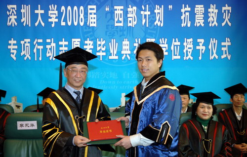 章必功致辭。他說,參加抗震救災的志愿者同學,體現了特區青年的情懷、深大學生的崇高境界。他們的行為讓08屆畢業典禮完美。有了今天這個典禮,深大2008屆畢業典禮與國家大事連接在一起。他代表學校對志愿者同學們表示由衷的敬意和感謝。他表示,九名同學很陽光、很精神,是深大學生的驕傲。他們經歷了08年抗震救災的大事,相信他們以后的人生將無所畏懼。他們自愿為災區人民做貢獻,值得師生們學習借鑒。希望他們到社會上堅持發揚抗震救災精神,做人永遠不要輸,一生一世與高尚、真理同行,做九顆青松。最后,他祝愿志愿者同學們就業有個很好的崗位,在未來的征程有更大的成績,有更好的前程。