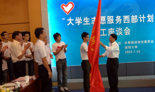 座談會后,10名第二批西部志愿者莊嚴宣誓。李意珍為第二批志愿者授旗。