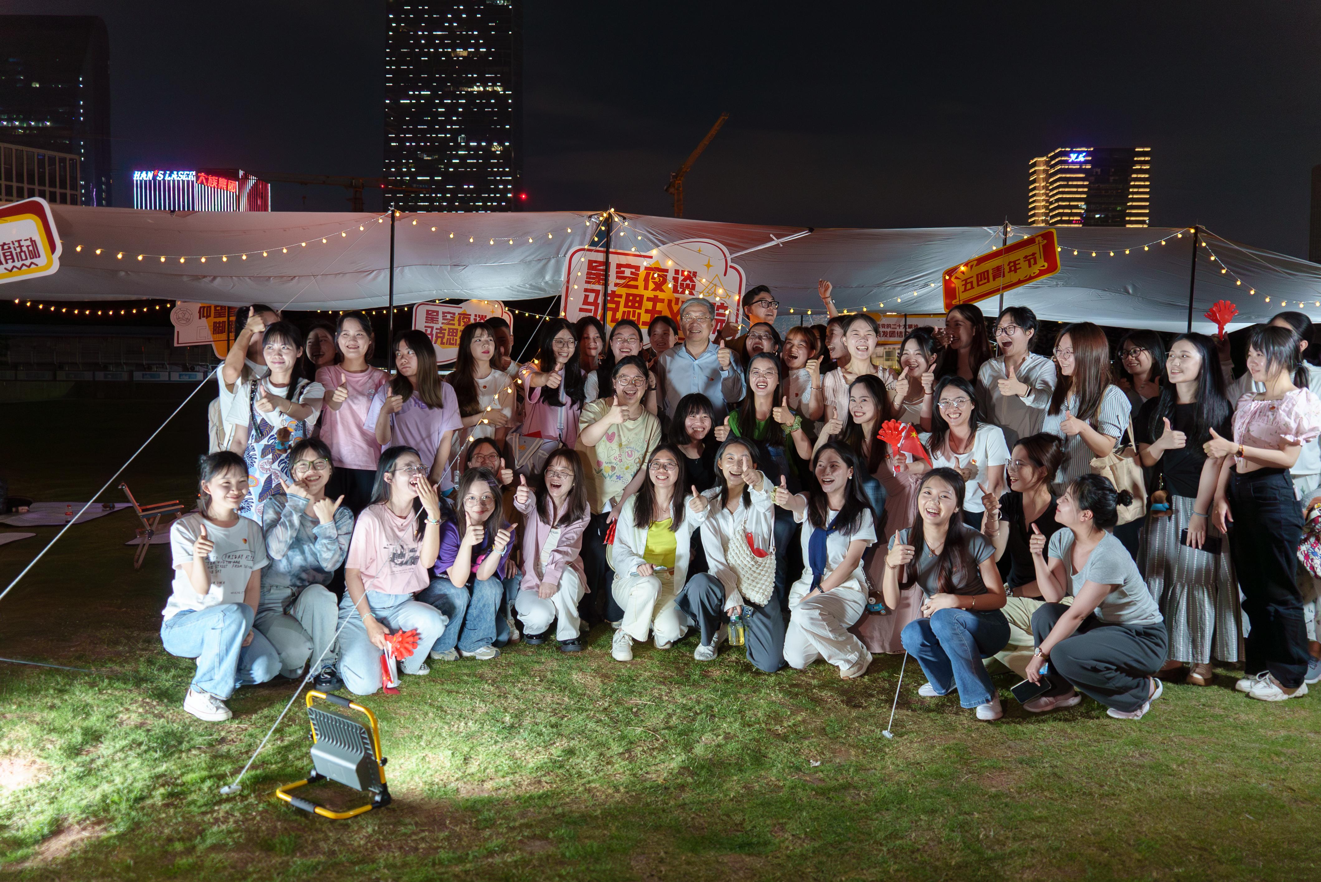 這是深圳大學(xué)馬克思主義學(xué)院“星空夜談”五四青年節(jié)專場活動上的一幕。為深入學(xué)習(xí)貫徹習(xí)近平新時代中國特色社會主義思想,5月3日晚,馬克思主義學(xué)院以創(chuàng)新的活動方式開展主題教育,校領(lǐng)導(dǎo)和師生圍坐一起,以當(dāng)下年輕人熱衷的“露營”方式進(jìn)行理論學(xué)習(xí)交流,打造了一堂生動新穎的思政課。學(xué)校黨委書記李清泉、副校長汪永成出席活動,黨委宣傳部、馬克思主義學(xué)院負(fù)責(zé)人以及學(xué)院師生、校友代表共80余人參加活動。