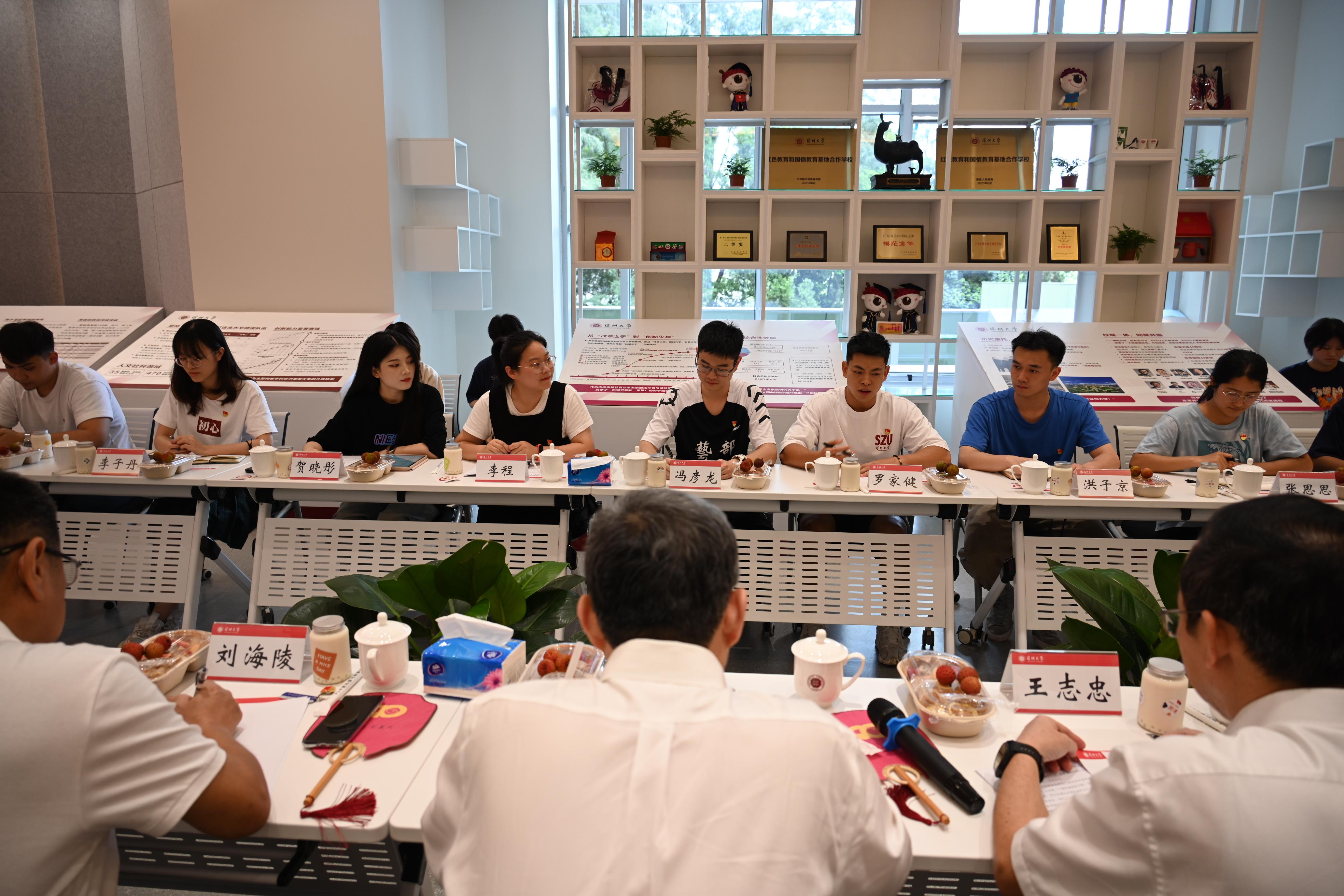 6月26日下午,深圳大學學習貫徹習近平新時代中國特色社會主義思想主題教育青年學生座談會暨書記下午茶在粵海校區(qū)聚翰齋一樓主題教育專題展廳舉辦。深圳大學黨委書記李清泉以及黨委組織統(tǒng)戰(zhàn)部、教務(wù)部、學生部、后勤保障部等職能部門負責人,與來自各學院的17名青年學生代表,就主題教育、學習生活、職業(yè)規(guī)劃等問題展開面對面溝通交流。省委主題教育第十九巡回指導(dǎo)組組長劉海陵、副組長黃友文到會指導(dǎo)。