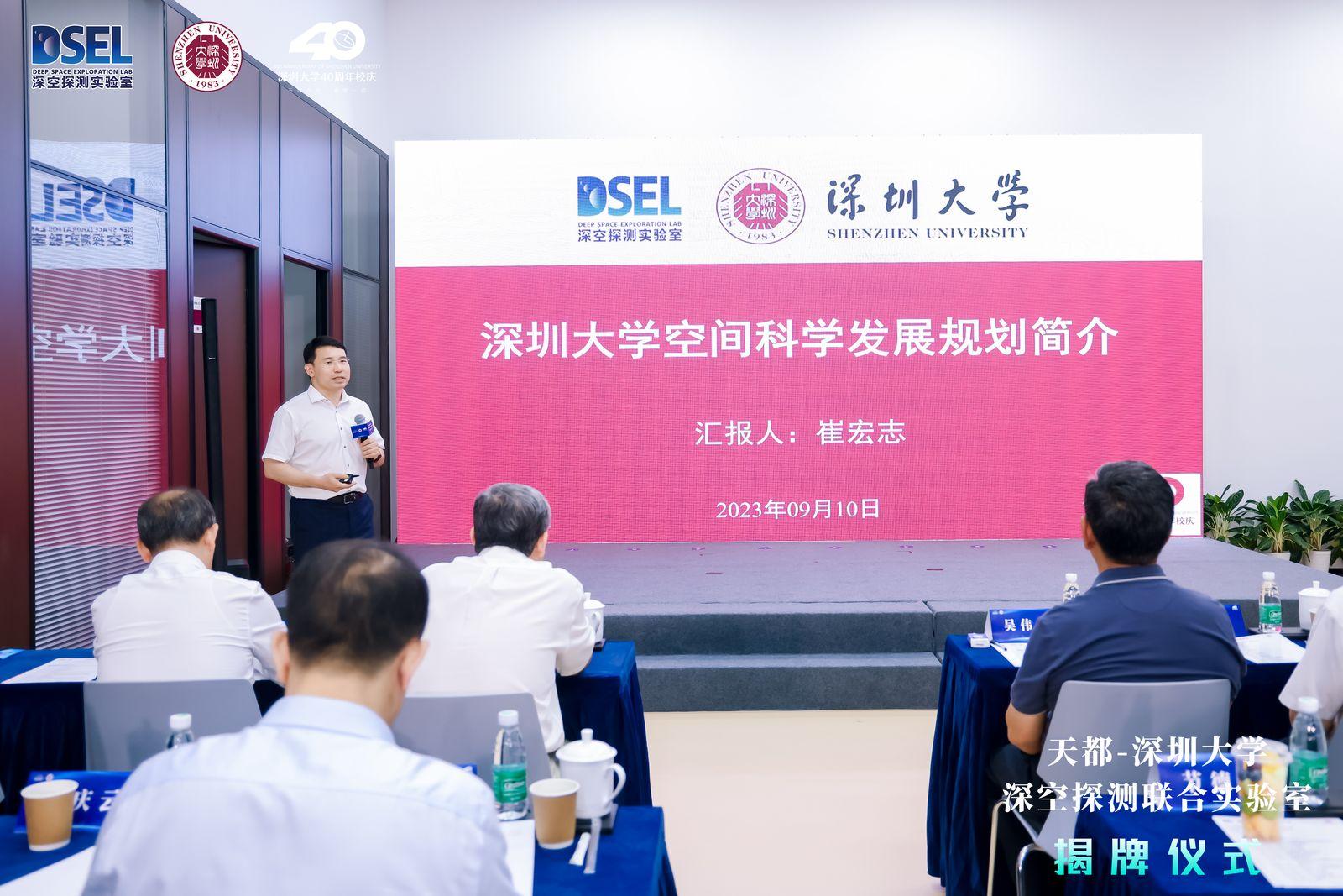 2023年9月10日,天都-深圳大學深空探測聯合實驗室揭牌儀式在深圳大學匯文樓舉行。深空探測實驗室主任兼首席科學家、中國工程院院士吳偉仁院士,副主任兼理事會秘書長胡朝斌,嫦娥七號任務副總師唐玉華,深圳市科創(chuàng)委副主任鐘海,基礎研究處處長陳慶云,深圳市發(fā)改委創(chuàng)新能力處副處長肖勇,深圳大學黨委書記李清泉教授,校長、中國科學院院士毛軍發(fā),中國工程院院士謝和平等代表出席了本次儀式,會議由深圳大學副校長周輝主持。