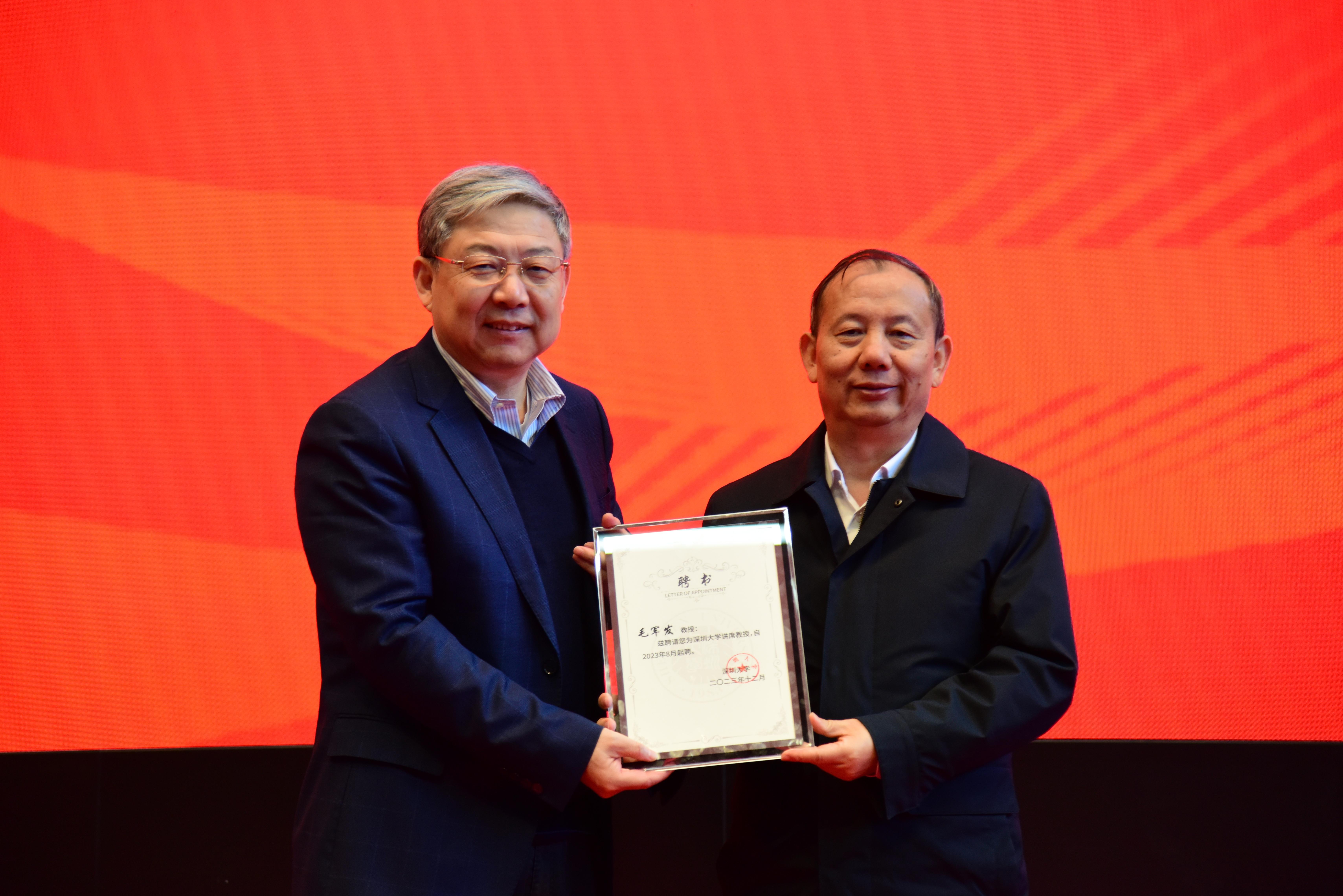 在新晉長聘教師代表聘任儀式上,毛軍發為鄒立業、黃龍彪等31位年度新晉長聘教師代表頒發聘書。作為國內率先實施預長聘教師制度的高校之一,深大充分借鑒國內外一流高校的先進經驗,立足校情開展長聘晉升工作。評價導向和結果充分堅持破除“五唯”傾向,突出思想政治和師德師風、教育教學能力業績、學術創新貢獻,實行代表性成果評價、國際國內同行評價等原則精神。2021年9月,學校舉行新體制首屆長聘教師聘任儀式,7名長聘教授、56名長聘副教授獲頒聘書。2021及2022年晉升長聘的教師共216人,首聘期考核長聘的教師共5人,目前學校共有284位長聘教師。