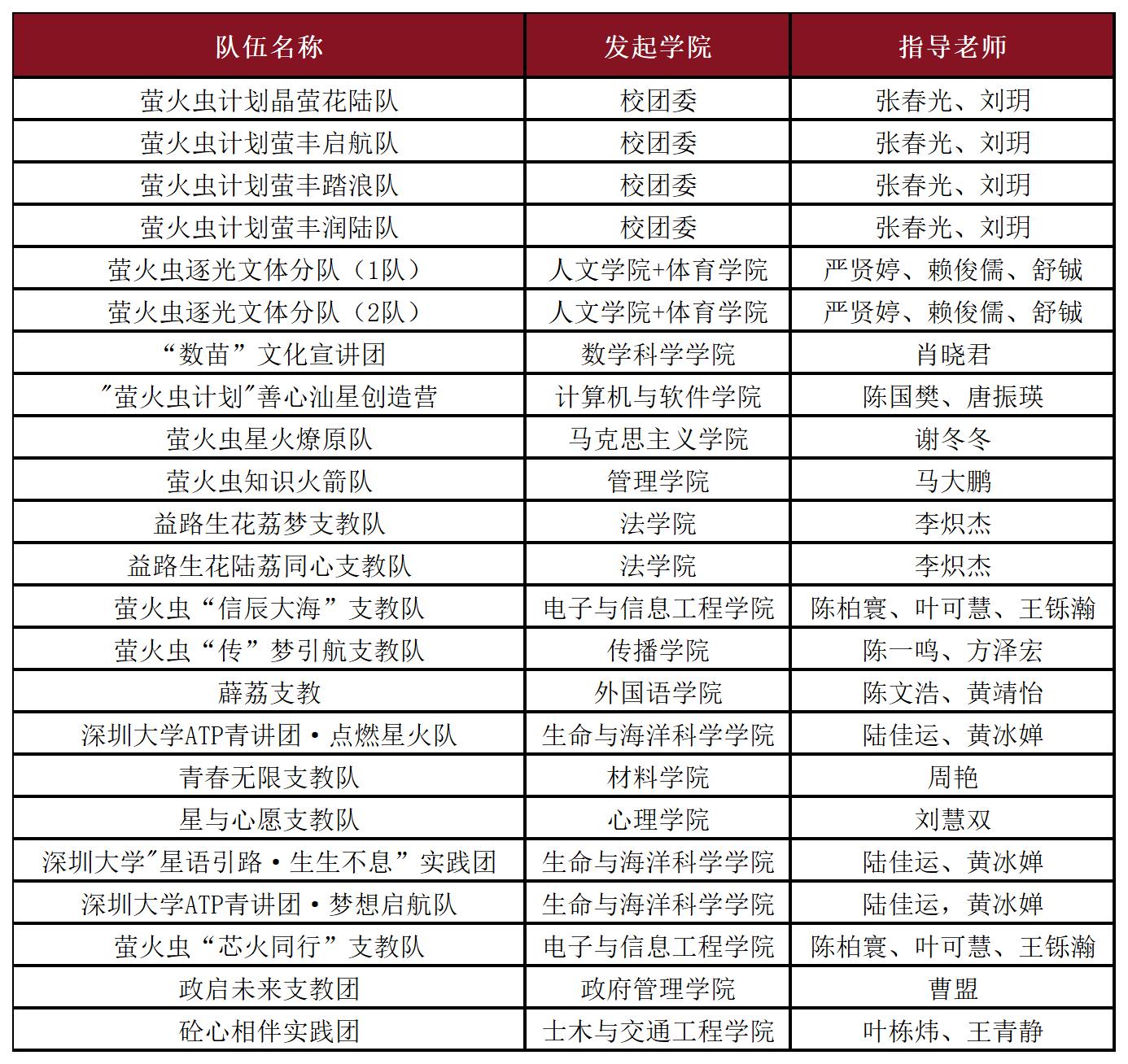 為深入貫徹落實“百千萬工程”青年突擊隊及“雙百行動”有關部署,有效發揮高校資源及學科優勢,切實服務結對地區中小學學生,為當地中小學學生提供趣味擴展課堂,校團委廣泛動員青年志愿者,組建了極具特色的高校青年突擊隊“深圳大學支教志愿服務隊”,共有36支支教隊伍進行預報名。