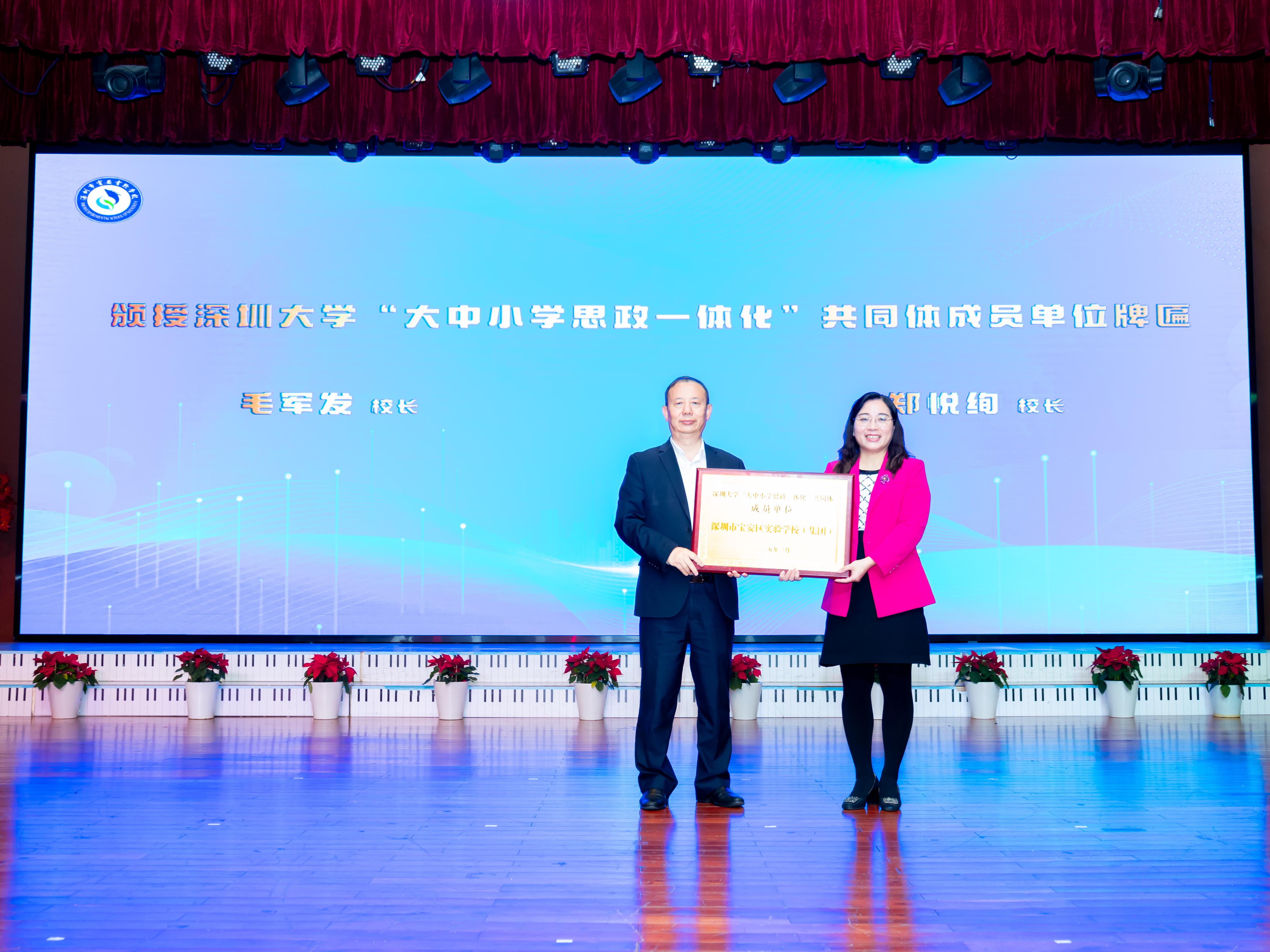 講座最后,毛軍發向寶安實驗學校授予深圳大學“大中小學思政一體化”共同體成員單位牌匾,寶安實驗學校向深圳大學回贈紀念品?!敖ㄔO科技強國需要對青少年從小培養責任與擔當。”毛軍發勉勵寶安實驗學子,“大家不僅要學知識,更要明白學這些知識是為了什么?!痹撔W生代表興奮地說:“今天我們不僅上了一堂生動有趣的思政課,更像是聆聽了一場激發我們斗志的‘科技宣言’!”