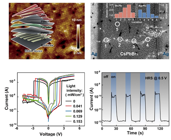 近日,我校電子科學(xué)與技術(shù)學(xué)院韓素婷副教授成果在Advanced Materials(影響因子:19.791, 中科院JCR一區(qū))上發(fā)表題為“Synergies of electrochemical metallization and valance change in all-inorganic perovskite quantum dots for resistive switching”的文章(Adv. Mater., 2018, DOI:10.1002/adma.201800327)。該文章的第一作者為電子科學(xué)與技術(shù)學(xué)院博士后王燕,高等研究院周曄研究員為共同通訊作者,深圳大學(xué)電子科學(xué)與技術(shù)學(xué)院為第一完成單位及通訊單位。作為下一代非易失型存儲(chǔ)器,阻變存儲(chǔ)器通過(guò)器件在不同電阻狀態(tài)(高阻態(tài)和低阻態(tài))之間的互相轉(zhuǎn)換來(lái)實(shí)現(xiàn)數(shù)據(jù)存儲(chǔ),具有單元尺寸小、讀寫(xiě)速度快、功耗低、制備工藝和器件結(jié)構(gòu)簡(jiǎn)單等優(yōu)點(diǎn)??茖W(xué)家根據(jù)不同材料體系構(gòu)建了不同的阻變存儲(chǔ)器模型,但是隱藏在背后的電阻轉(zhuǎn)變機(jī)理仍不夠清晰。如何進(jìn)一步實(shí)現(xiàn)對(duì)阻變機(jī)理的實(shí)時(shí)動(dòng)態(tài)分析,制備性能更優(yōu)異的存儲(chǔ)器具有重要的研究?jī)r(jià)值。本文首次將無(wú)機(jī)鹵素鈣鈦礦CsPbX3量子點(diǎn)應(yīng)用在阻變存儲(chǔ)器中,系統(tǒng)性研究不同光照條件對(duì)存儲(chǔ)器阻變性能的影響,對(duì)今后光控存儲(chǔ)器的開(kāi)發(fā)具有一定的指導(dǎo)意義,能夠成為該方向上的一個(gè)重要亮點(diǎn)。同時(shí)創(chuàng)新性地利用SEM、EDX技術(shù)對(duì)水平結(jié)構(gòu)器件進(jìn)行動(dòng)態(tài)監(jiān)測(cè)。在阻變存儲(chǔ)器機(jī)理研究領(lǐng)域方法新穎,具有可借鑒推廣性。為實(shí)現(xiàn)高性能存儲(chǔ)器的制備提供了一種簡(jiǎn)單高效的理論研究方法。