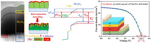 近年來,新型環境友好型Sb2Se3材料由于物相單一,光學帶隙可調以及較高的光吸收系數,介電常數和載流子遷移率等優點,在無機薄膜太陽電池領域得到廣泛關注和研究,但Sb2Se3薄膜太陽電池性能與CIGS薄膜太陽電池性能相比還有較大差距,其中主要原因是Sb2Se3材料自身有效摻雜濃度較低,整體表現為電池開路電壓虧損偏高。前期,課題組提出采用與CIGS太陽電池生產工藝兼容性較高的磁控濺射技術結合后硒化熱誘導生長出高度擇優取向的Sb2Se3薄膜,并制備出光電轉換效率為6.06 %的Sb2Se3薄膜太陽電池,相關成果發表在Nano Energy. 64. 2019. 103929;本文則報道Sb2Se3薄膜太陽電池中的異質結Sb2Se3/CdS在經過熱處理后,發現Cd2+和S2-離子擴散進入光吸收層Sb2Se3內,器件光電轉換效率提升至6.84%,其中開路電壓提升至504 mV(是目前已報道的Sb2Se3薄膜太陽電池最高開路電壓值),分析原因主要是Cd2+有效摻雜獲得P型導電增強和S2-離子摻雜光學帶隙拓寬,相關成果發表在Nano Energy. 73. 2020. 104806。此外,將無封裝的全無機Sb2Se3薄膜太陽電池存放于空氣中,1000小時內仍能保證90%的初始光電轉換效率,顯示了良好的穩定性。