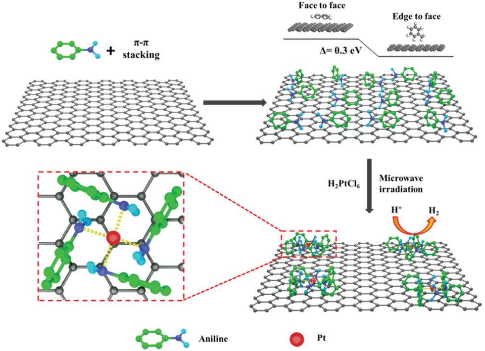 氫能作為一種重要的清潔能源,具有高能量密度、可再生和清潔無污染的優(yōu)點(diǎn),在未來綠色新能源開發(fā)中占據(jù)著極其重要的地位。隨著電能的普及和成本的下降,電解水制氫成為未來最有效的制氫方法。因此,開發(fā)高效的HER電催化劑是電解水制氫大規(guī)模工業(yè)化應(yīng)用的關(guān)鍵。該研究團(tuán)隊(duì)開發(fā)了一種新穎簡便的苯胺錨定和微波還原法在石墨烯上負(fù)載鉑單原子(Pt SASs/AG)用作析氫催化劑。該方法簡單易行、制備條件溫和,制備過程中無需進(jìn)行高溫處理,并且不論貴金屬前驅(qū)體用量多少,均能專一地形成單原子位點(diǎn)分散在石墨烯表面。同時(shí)該方法還利用了石墨烯優(yōu)異的導(dǎo)電性能,很好地解決了單原子催化劑應(yīng)用于電催化體系的技術(shù)瓶頸。研究發(fā)現(xiàn),Pt SASs/AG具有優(yōu)異的HER活性,在電流密度為10mA cm-2時(shí)過電勢η= 12mV,在η= 50mV時(shí)質(zhì)量電流密度為22400 A g-1Pt,比市售20wt% Pt/C高46倍。 此外,Pt SASs/AG催化劑比Pt/C具有更為優(yōu)異的穩(wěn)定性。密度泛函理論(DFT)計(jì)算表明原子級(jí)分散的Pt位點(diǎn)與苯胺上的N結(jié)合優(yōu)化了Pt的電子結(jié)構(gòu)和氫吸附能,使得Pt單原子表現(xiàn)出優(yōu)異的HER催化活性。該研究為單原子催化劑的制備和應(yīng)用研究提供了全新的思路。