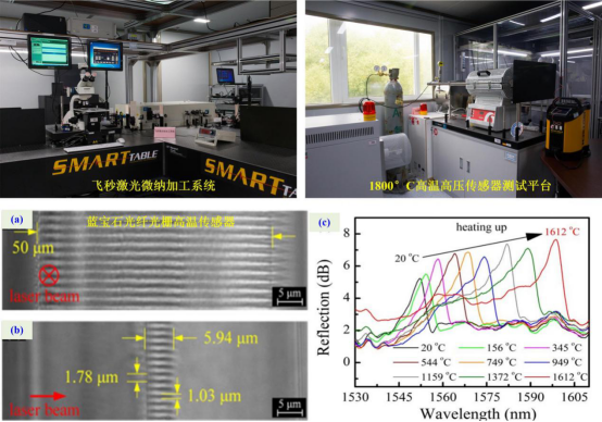 單晶藍寶石光纖的熔點高達2050℃,是實現高溫傳感器的最佳選擇。但是,如何在這種藍寶石光纖中制備出高溫傳感器是長期困擾科研人員的難題。王義平教授團隊提出利用飛秒激光在單晶藍寶石光纖內部周期性刻線的創新方法,成功制備出高質量的藍寶石光纖光柵高溫傳感器,從而實現了1612℃的超高溫分布式測量。