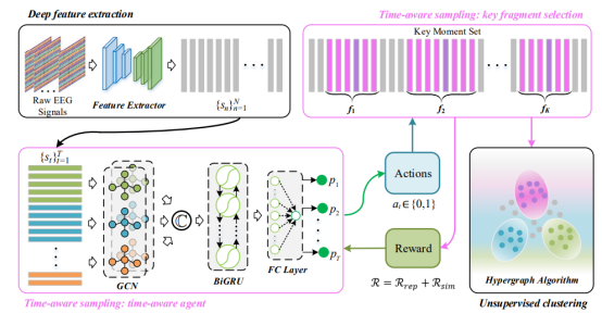 在本文中,我們將從EEG時間序列中挖掘關鍵情感片段的過程形式化為馬爾可夫決策過程,并通過DRL訓練生成一個時間感知代理,無需使用標簽信息。首先,時間感知代理從特征提取器獲取深度特征作為輸入,并生成樣本級的重要性分數,反映了每個樣本包含的情感相關信息。然后,基于獲得的樣本級重要性分數,我們保留與情感高度相關的前X個連續EEG片段,同時丟棄其余部分。最后,我們將這些連續片段視為關鍵情感片段,并將它們輸入到一個超圖解碼模型中,以進行無監督聚類。