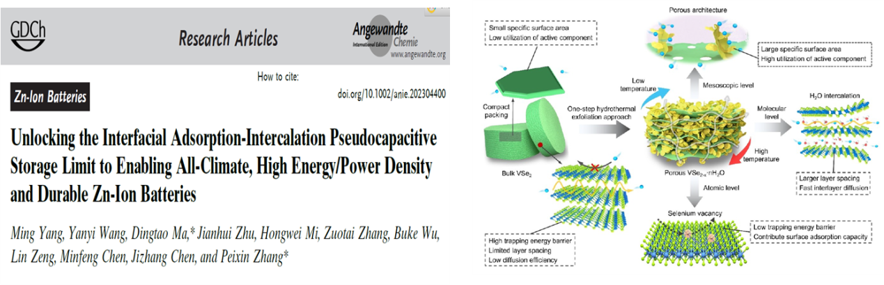 2.為解決用于鋅離子存儲(chǔ)的過(guò)渡金屬硫族化合物(TMDs) 存儲(chǔ)動(dòng)力學(xué)緩慢和性能差等問(wèn)題,提出了一種多尺度界面結(jié)構(gòu)集成調(diào)制概念,以解鎖全方位存儲(chǔ)動(dòng)力學(xué)增強(qiáng)的多孔VSe2-x·nH2O宿主,同時(shí)還發(fā)現(xiàn)了一種界面吸附-插層贗電容存儲(chǔ)機(jī)制。這項(xiàng)工作實(shí)現(xiàn)了概念上的突破,擴(kuò)展了層狀TMDs的界面存儲(chǔ)極限,以構(gòu)建全天候高性能鋅離子電池。該成果發(fā)表在《Angewandte Chemie International Edition》(2023,62:e202304400)。深圳大學(xué)為第一完成單位和唯一通訊單位,博士研究生楊明為論文第一作者,張培新教授和馬定濤副研究員為共同通訊作者。論文鏈接:https://doi.org/10.1002 / anie.202304400