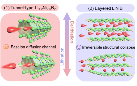 圖1.孔道狀Li1.2Ni2.5B2和層狀LiNiB的結構示意圖
