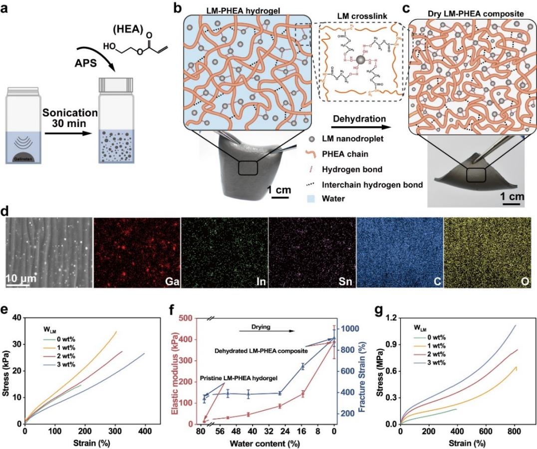 液態(tài)金屬納米液滴與引發(fā)劑過(guò)硫酸銨(APS)協(xié)同引發(fā)單體2-羥乙基丙烯酸酯(HEA)的聚合,實(shí)現(xiàn)在2 min內(nèi)快速凝膠化,形成聚合物液態(tài)金屬?gòu)?fù)合水凝膠(圖1a-d)。其中,液態(tài)金屬納米液滴通過(guò)表面的氧化物與聚合物鏈形成氫鍵,能夠作為一種物理交聯(lián)點(diǎn)增強(qiáng)凝膠的機(jī)械性能(圖1e)。經(jīng)過(guò)干燥處理后,復(fù)合材料的機(jī)械性能大幅增強(qiáng),彈性模量和斷裂應(yīng)變從最初的12.7 kPa和340%分別提高到388 kPa和913%(圖1f-g)。