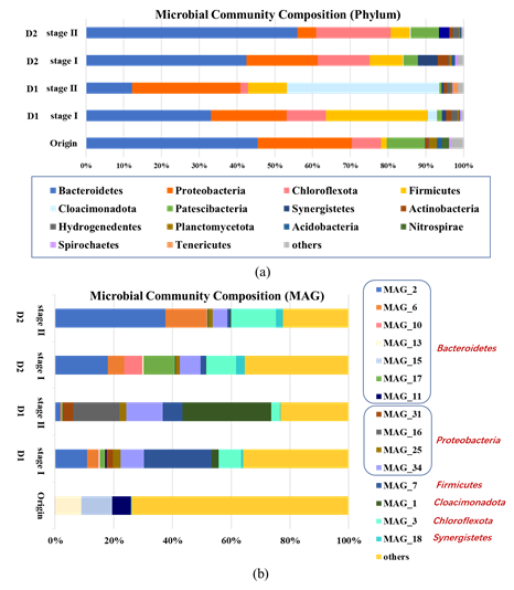 圖3(a)豐度前15%物種在門水平上的相對豐度;(b)豐度前15%的MAG(D1:甲酸鹽進料;D2:乙酸鹽進料)