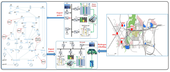 HFCEV的加氫仍然是一個亟待解決的問題。本文提出一種基于氫電微網(wǎng)來生產(chǎn)氫氣,為HFCEV加氫,并提出了不同的策略來引導HFCEV在交通網(wǎng)絡與電力系統(tǒng)耦合下的加氫行為。首先,根據(jù)實際交通網(wǎng)絡構建HFCEV交通流模型。其次,建立實時仿真算法。第三,構建基于氫氣的微電網(wǎng)為HFCEV加氫。第四,建立IEEE 30節(jié)點電網(wǎng)輸出功率模型。最后,提出通過交通網(wǎng)絡與電力網(wǎng)絡的耦合實現(xiàn)HFCEV實時加氫。耦合結構如圖1,并比較了不同的HFCEV加氫策略(固定價格、動態(tài)價格、LSTM決策價格)。結果表明,在動態(tài)價格下,交通網(wǎng)絡的擁堵得到改善,等待時間減少了17.71%,網(wǎng)絡的時間損失減少了13.29%。通過合理的價格引導,車輛會選擇指定的站點進行氫氣加注,并影響交通網(wǎng)絡車流量的時空分布。此外,通過調(diào)整發(fā)電站輸出功率和加氫站輸入功率,可以改善電力系統(tǒng)的電壓條件。