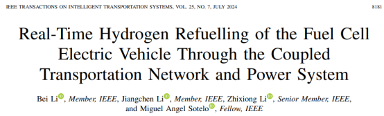 近日,深圳大學化學與環(huán)境工程學院李倍老師在領域頂級期刊IEEE Transactions on Intelligent Transportation Systems(影響因子7.9,中科院1區(qū),TOP期刊)上發(fā)表了題為“Real-Time Hydrogen Refuelling of the Fuel Cell Electric Vehicle Through the Coupled Transportation Network and Power System”的研究論文。李倍為獨立第一作者。深圳大學為第一單位。其他作者包括Jiangchen Li, Nanjing University of Aeronautics and Astronautics, China;Zhixiong Li, Opole University of Technology, Poland;Miguel Angel Sotelo, University of Alcalá, Spain。
