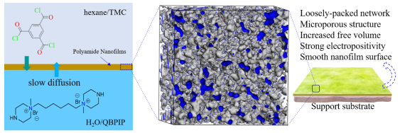 鋰在清潔能源技術(shù)中發(fā)揮著不可或缺的作用,鹽湖鹵水蘊(yùn)藏著全球約70%的鋰資源,鹽湖鋰資源的開發(fā)具有重大戰(zhàn)略意義。相較于傳統(tǒng)分離方法,納濾技術(shù)因較低操作壓力等優(yōu)勢而受到青睞。通過單體界面聚合(IP)形成的聚酰胺(PA)納濾(NF)膜廣泛應(yīng)用于鹽湖鹵水鋰鎂分離。但由于鹽湖鹵水中的鎂/鋰比相對較高,傳統(tǒng)NF膜存在滲透性和選擇性的相互制約關(guān)系,影響其整體分離性能。NF膜的分離層電荷密度和孔徑調(diào)節(jié)是鋰鎂分離性能提升的重要因素。因此,構(gòu)建新型的分離層界面聚合單體,從結(jié)構(gòu)角度改善納濾膜的分離性能,是提升鋰鎂分離效果的一個重要的研究方向。