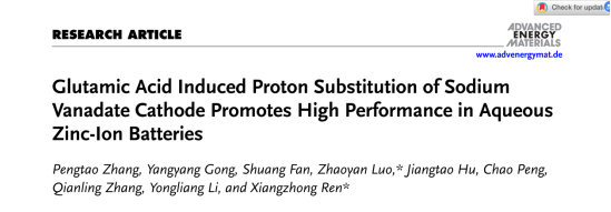 深圳大學化學與環境工程學院任祥忠教授團隊在材料領域頂尖期刊《Advanced Energy Materials》(影響因子24.4,中科院JCR 1區,TOP期刊)發表了題為《Glutamic Acid Induced Proton Substitution of Sodium Vanadate Cathode Promotes High Performance in Aqueous Zinc-Ion Batteries》的研究論文。該團隊碩士生張鵬濤為論文第一作者,深圳大學任祥忠教授和羅兆艷助理教授為該論文共同通訊作者,深圳大學為第一作者單位和第一通訊單位。