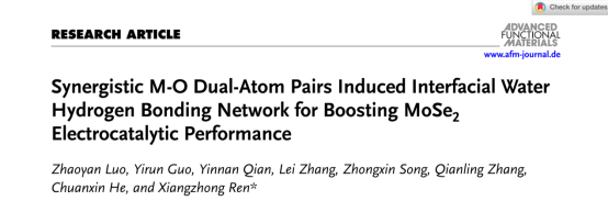 深圳大學化學與環境工程學院任祥忠教授團隊在材料領域頂尖期刊《Advanced Functional Materials》(影響因子18.5,中科院JCR 1區,TOP期刊)發表了題為《Synergistic M-O Dual-Atom Pairs Induced Interfacial Water Hydrogen Bonding Network for Boosting MoSe2Electrocatalytic Performance》的研究論文。該團隊助理教授羅兆艷和碩士研究生生郭逸潤為論文共同第一作者,深圳大學任祥忠教授為該論文通訊作者,深圳大學為唯一作者單位和唯一通訊單位。