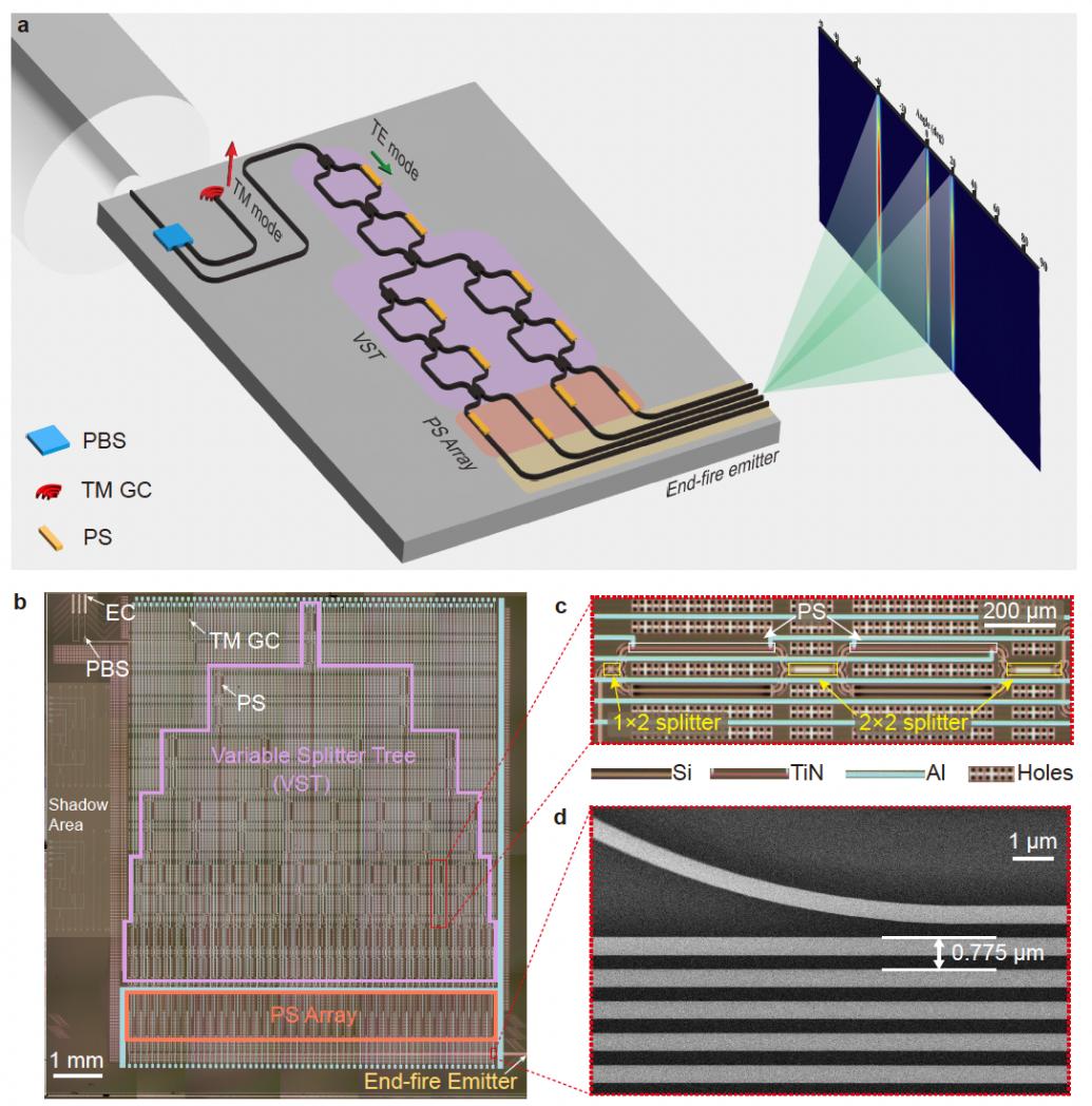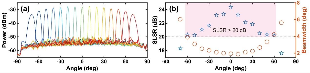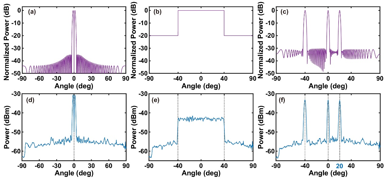 該研究提出一種新型硅基光學相控陣架構,首次在單個硅基光學相控陣中同時實現了大視場、高旁瓣抑制比和復雜波束賦形功能。