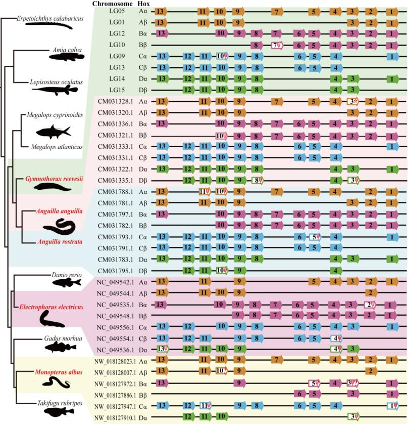Hoxtbx兩個基因家族與魚類鰭條發育密切相關。分析發現,海水鰻(無胸鰭)基因組中某些Hox基因(如HoxB9βHoxD13)發生丟失,并且特定tbx基因(tbx5)出現變異(圖3),這些可能是鰻鱺目魚類胸鰭退化的關鍵因素。