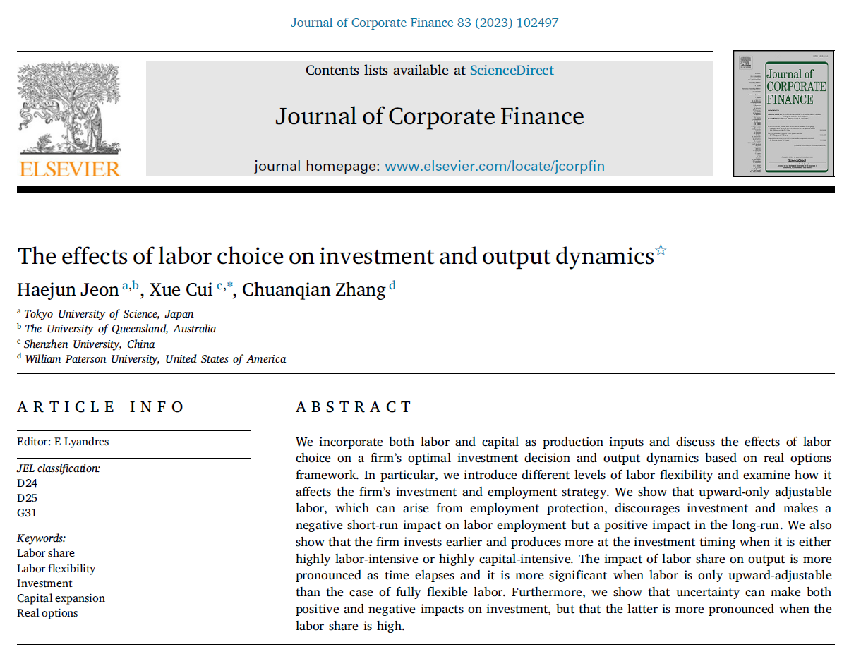 近日,經(jīng)濟學院崔雪助理教授在公司金融領域國際著名期刊《Journal of Corporate Finance》上發(fā)表題為“The effects of labor choice on investment and output dynamics”的論文。《Journal of Corporate Finance》是公司金融領域國際著名期刊之一,在國內外具有很高的聲望,是SSCI收錄JCR一區(qū)和ABS四星級期刊,最新公布的影響因子為6.1。該文章是經(jīng)濟學院崔雪助理教授作為通訊作者與日本東京理科大學Haejun Jeon副教授、美國威廉帕特森大學張傳千副教授合作完成,深圳大學是通訊作者唯一署名單位。